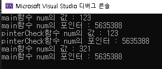 위의 코드는 main함수에서 num변수를 선언해 이 값을 pointerCheck함수로 보내고,