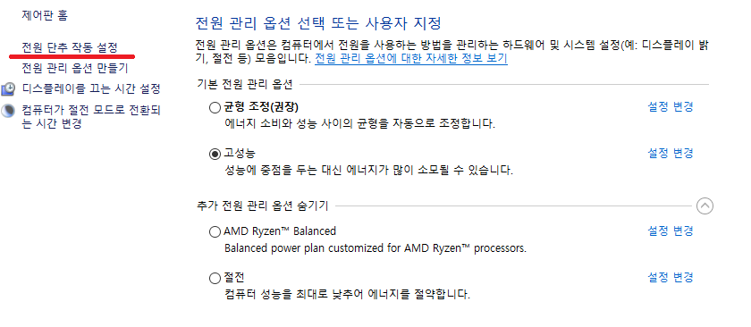시작 -> 전원 옵션 -> 전원 단추 작동 설정으로 이동