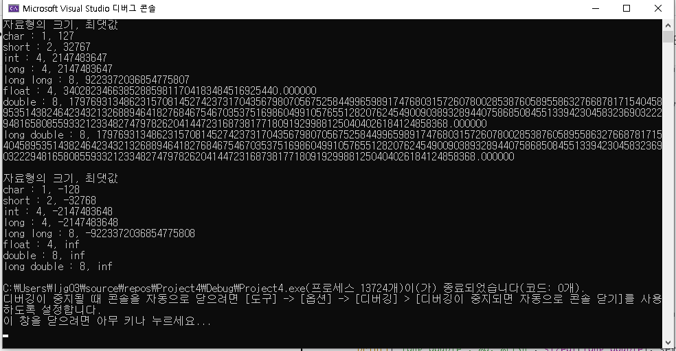 실행화면을 보시면 자료형의 크기가 바이트 단위로 표시되고, 그 자료형의 최댓값이