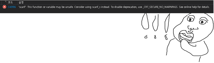 scanf함수가 취약하니 scanf_s를 사용하거나 _CRT_SECURE_NO_WARNINGS를 사용하라는 뜻입니다.