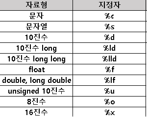 어떤 자료형에 어떤 지정자가 필요한지는 표를 보고 기억해주시기 바랍니다.