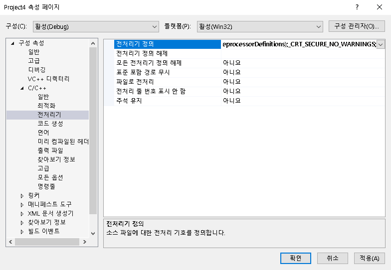 구성 속성 -> C/C++ -> 전처리기 -> 전처리기 정의에서