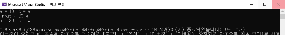 int변수 a와 char변수 c를 초기화한 뒤 값을 출력하고,